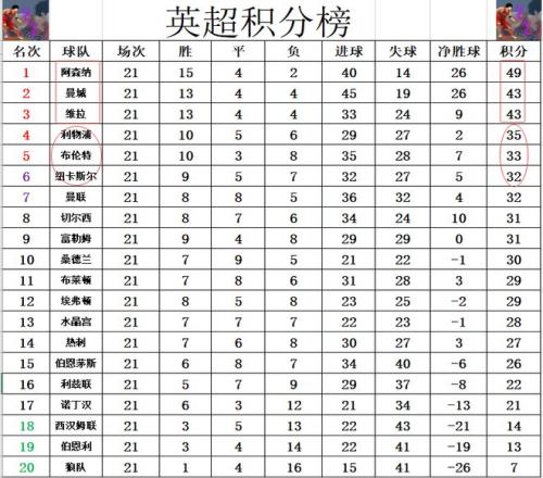 积分榜方面,上轮前6的球队本轮都无力赢球,阿森纳,曼城,维拉,利物浦和曼联都是平局,只有切尔西输了球,阿森纳还是6分优势力压曼城和维拉领跑,利物浦还是差阿森纳14分排在第4。布伦特和纽卡斯尔追上来,两队将曼联和切尔西挤出前6,布伦特差利物浦2分排在第5。
